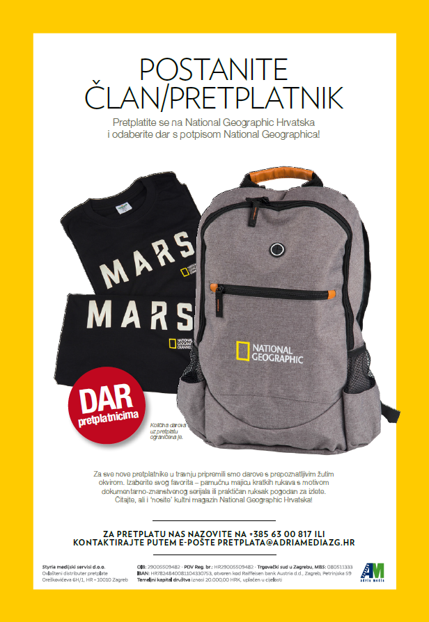 Pretplatite se na National Geographic Hrvatska do 15. svibnja 2018. godine i odaberite poklon – ruksak ili majicu s potpisom National Geographica Hrvatska. Količina darova uz pretplatu je ograničena, stoga požurite.