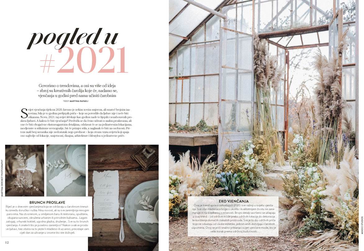 Svijet vjenčanja tijekom 2020. krenuo je nekim novim smjerom, ali unatoč brojnim izazovima, bila je to godina prelijepih priča – koje su potvrdile da ljubav nije i neće biti otkazana. Novu, 2021. taj svijet iščekuje kao godinu nade te lijepih i nezaboravnih proslava ljubavi. A kakva će biti vjenčanja? Predviđa se da ćemo uživati u malim proslavama, ali one će biti obogaćene ekstravagantnim detaljima, održavat će se na jedinstvenim lokacijama, zaodjenute u stilizirane scenografije, bit će primjer stila, a naglasak će biti na osobnosti. Pritom mali broj uzvanika nije nedostatak nego prednost – koja otvara vrata svijetu koji spaja ono najbolje od lokacije, umjetnosti, dizajna, arhitekture i lifestylea u jedinstvene priče.