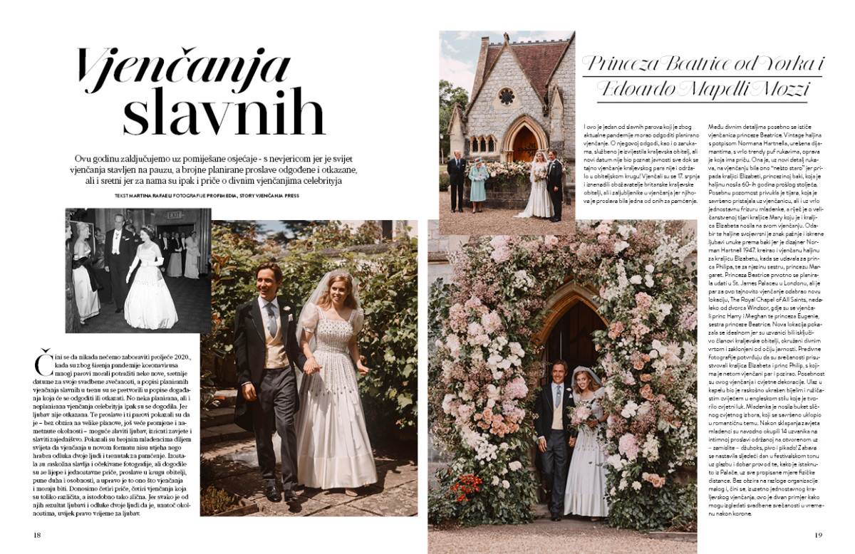 Čini se da nikada nećemo zaboraviti proljeće 2020., utjecaj pandemije koronavirusa, brojne parove koji su tražili neke nove, sretnije datume za svoja vjenčanja, liste s očekivanim vjenčanjima slavnih parova u trenu su postale popis događaja koji se neće dogoditi, barem ne kada i kako se očekivalo. Ali, neka od planiranih ali i neplaniranih vjenčanja slavnih ipak su se dogodila. Jer, ljubav nije otkazana. I u trenu ta su vjenčanja, ti parovi, postali svjetli primjeri da bez obzira na velike planove, još veće promjene i nametnute okolnosti moguće je slaviti ljubav, izricati zavjete, slaviti zajedništvo. Postali su primjer brojnim mladencima diljem svijeta da vjenčanja u novom formatu nisu utjeha već hrabra odluka dvoje ljudi, trenutak za pamćenje. Izostala je moda, izostala su raskošna slavlja, izostale su očekivane fotografije ali dogodile su se lijepe i jednostavne priče, vjenčanja u krugu obitelji, vjenčanja puna duha i osobnosti, a upravo je to ono što vjenčanju i moraju biti. Donosimo četiri priče, četiri vjenčanja koja su međusobno tako drugačija a opet tako slična. Jer svako od ovih vjenčanja rezultat je ljubavi I odluke dvoje ljudi da je bez obzira na okolnosti vrijeme za ljubav.