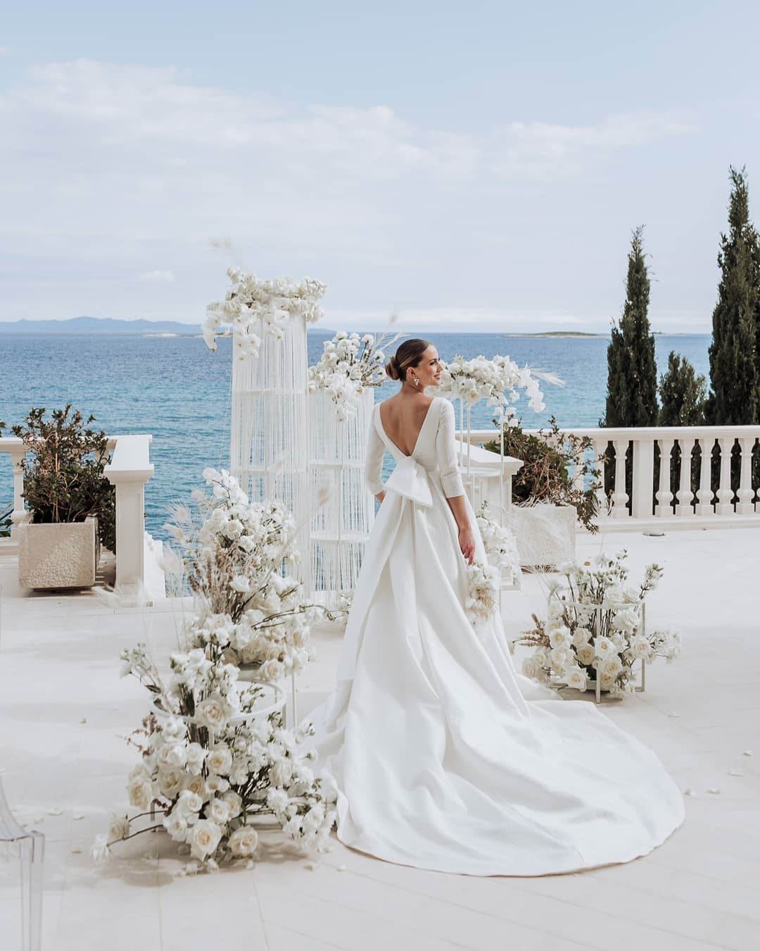 Ceremonija vjenčanja bila je smještena u centralni dio vile koji se oslanja na raskošno stubište koje vodi prema moru i s kojeg se pruža čaroban pogled na morsku obalu, ali i vilu. Kružne podne i viseće cvjetne instalacije oslanjale su se na doživljaj kupole koja krasi pročelje vile povezujući njezine velebne, visoke dijelove i pročelje. Centralni stol bio je zamišljen uz prostranu terasu s koje se pruža predivan pogled, a kako bi taj doživljaj ostao netaknut naglasak je bio na cvjetnim detaljima koji su skladno povezali stol i eksterijer vile.