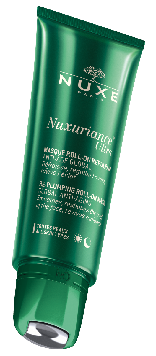 Roll-on maska za trenutno zaglađivanje Inovativna Nuxuriance® Ultra Roll-on maska za zrelu kožu s integriranim aplikatorom za masažu lica pruža trenutne rezultate u zaglađivanju bora i vraćanju sjaja zreloj koži. Bi-floralnim stanicama dragocjenog šafrana i bugenvilije stimulira proizvodnju novih stanica kože, popunjava ju i učvršćuje, dok ekskluzivan prirodni kompleks (ekstrakt morske alge, polisaharidi planktona, stanice kakaa, mikrohijaluronska kiselina) u trenu zaglađuje i hidratizira kožu. Prirodna hijaluronska kiselina na površini kože formira hidratantnu mrežicu koja zadržava vlagu i popunjava bore – za trenutni efekt zaglađivanja. Ekstrakt korijena mace aktivira mikrocirkulaciju kože i oživljava blistavost.
