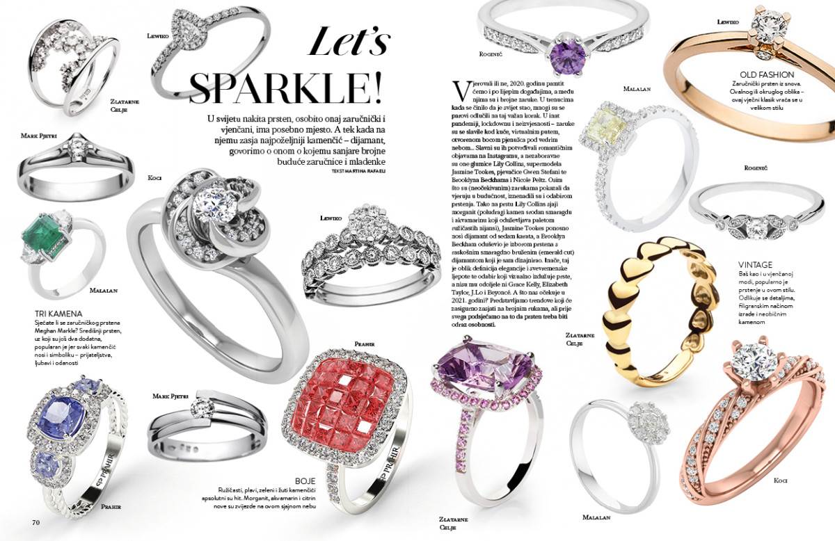 Potvrda zarukama slavnih bile su romantične Instagram objave, a nezaboravne su one glumice Lily Collins, supermodela Jasmine Tookes, pjevačice Gwen Stefani te Brooklyna Beckhama i Nicole Peltz. Osim što su (neočekivanim) zarukama ukazali da vjeruju u budućnost iznenadili su i odabirom prstena. Pa tako na prstu Lily Collins sjaji prsten s ružičastim morganitom (poludragi kamen kamen srodan smaragdu i aquamarinu koji oduševljava paletom ružičastih nijansi), Jasmine Tooks s ponosom nosi dijamant od 7 karata, dok je Brooklyn Beckham oduševio izborom, prstenom s raskošnim emerald cut dijamantom koji je samostalno dizajnirao. Inače ovaj je oblik definicija elegancije, svevremenske ljepote i odabir koji vizualno izdužuje prste, onaj kojem nisu odolile niti Grace Kelly, Elizabeth Taylor, J.Lo, Beyoncé. A što nas od trendova očekuje u 2021.? Otkrijte u temi Let's Sparkle, a mi vam moramo otkriti da nećemo moći odliti velikim primjercima u boji ;)