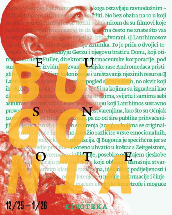 Lanthimosov zasad posljednji film Bugonia nije iznimka. To je priča o dvojici teoretičara zavjere – Teddyju Getzu i njegovu bratiću Donu, koji otimaju Michelle Fuller, direktoricu farmaceutske korporacije, pod sumnjom da je izvidnica izvanzemaljske rase Andromedaca pristiglih na Zemlju s ciljem kolonizacije i uništavanja njezinih resursa.