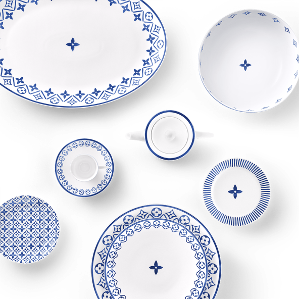 Njihov prepoznatljiv monogram dolazi ovoga puta u plavoj boji na bijelom porculanu, a uključeni su desertni tanjurići, obični tanjuri, setovi za čaj i šalice za kavu.